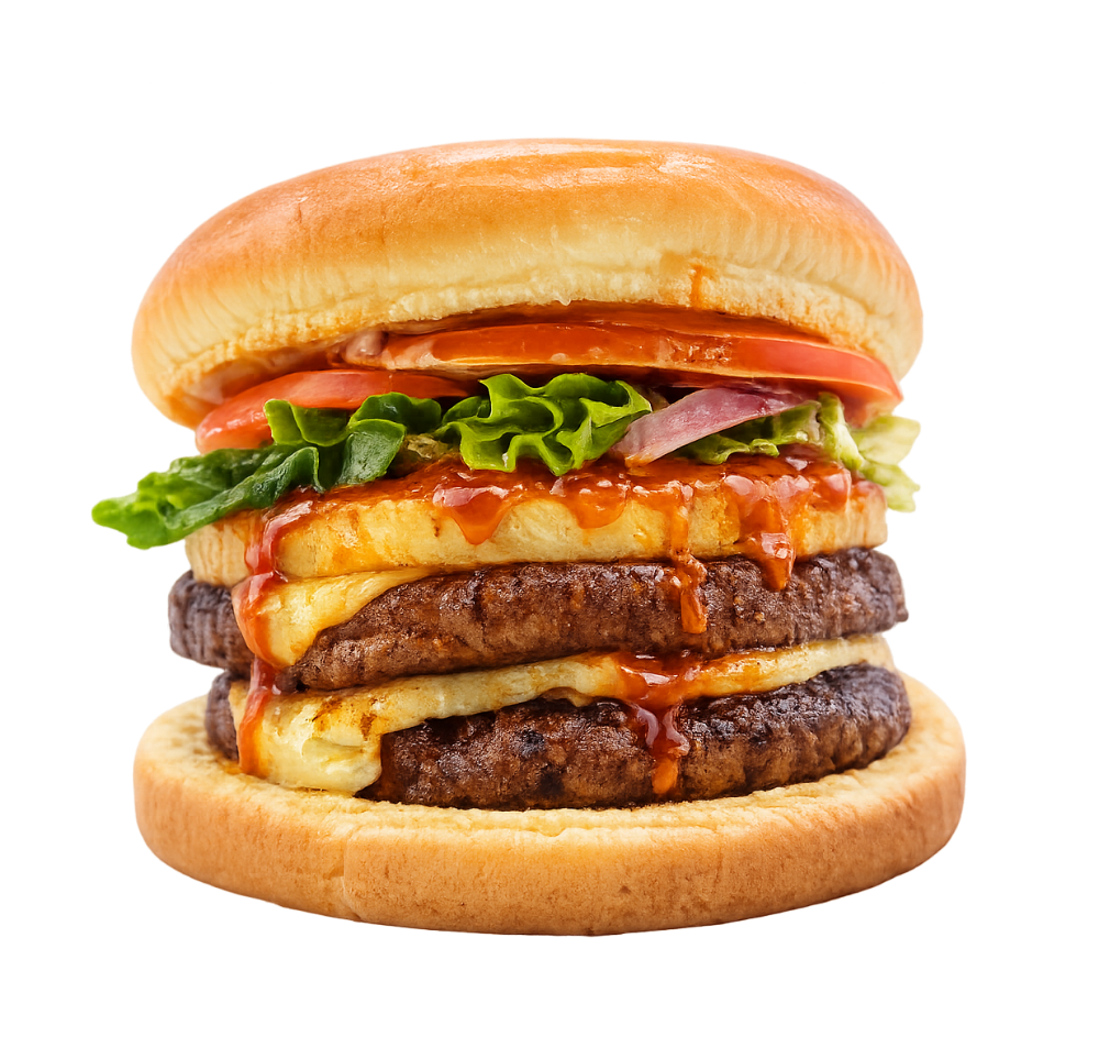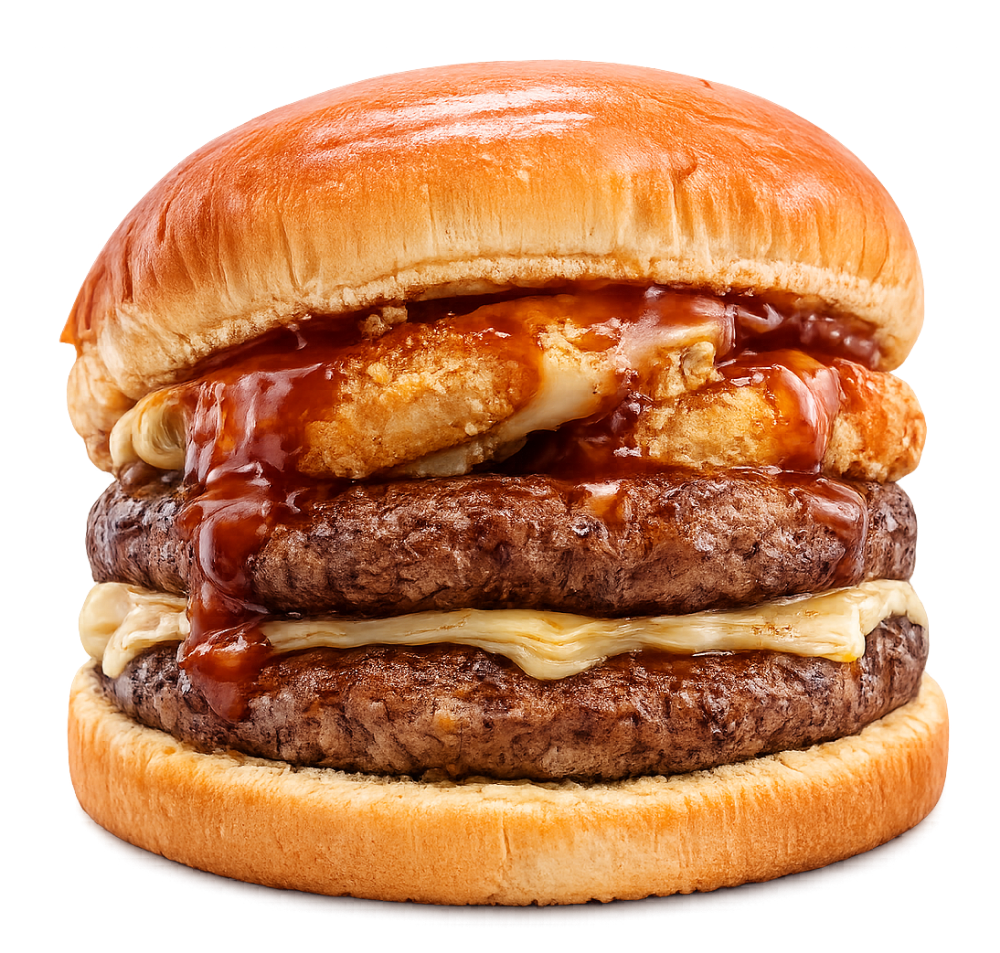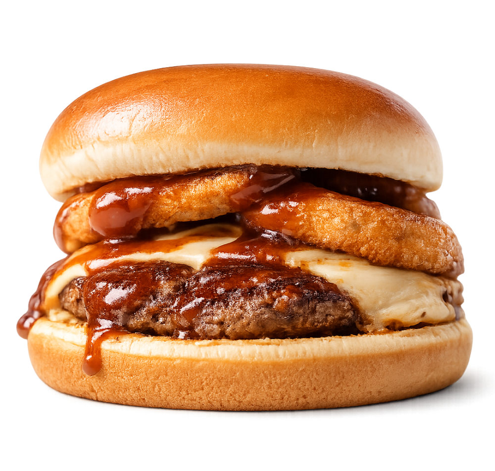 Una hamburguesa hecha para los que vienen con hambre de verdad. Dos jugosas carnes, con queso derretido, coronadas con aros de cebolla crujientes que le dan el toque perfecto de textura. Bañada con una salsa BBQ intensa y ahumada que se escurre en cada mordida, todo dentro de un pan suave y doradito. Poderosa, cargada y brutalmente deliciosa.