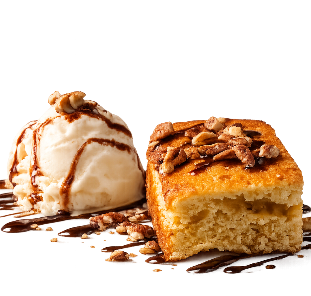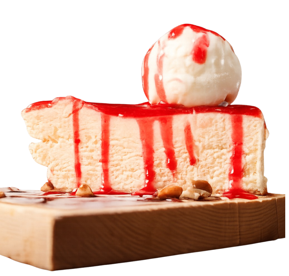 Una rebanada suave, cremosa y perfectamente esponjosa, servida sobre tabla para darle ese toque rústico irresistible. Coronada con una bola de helado y bañada con salsa de fresa que es pura tentación en cada gota.