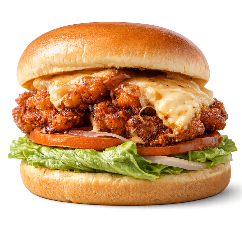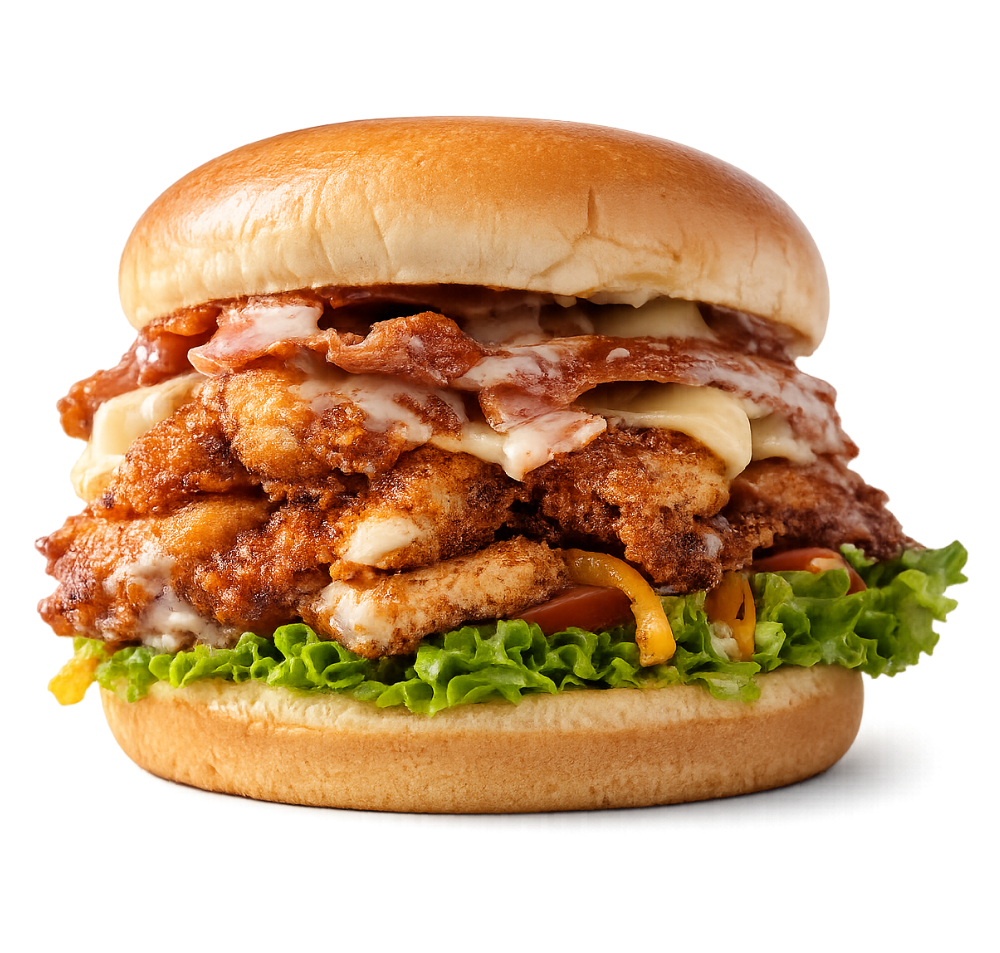 Para los verdaderos Rebeldes 150 g de pechuga crujiente con queso derretido, tocino frito, Fresco tomate, y cebolla, pimientos de temporada, lechuga y ranch. Que hacen el combo perfecto e irresistible